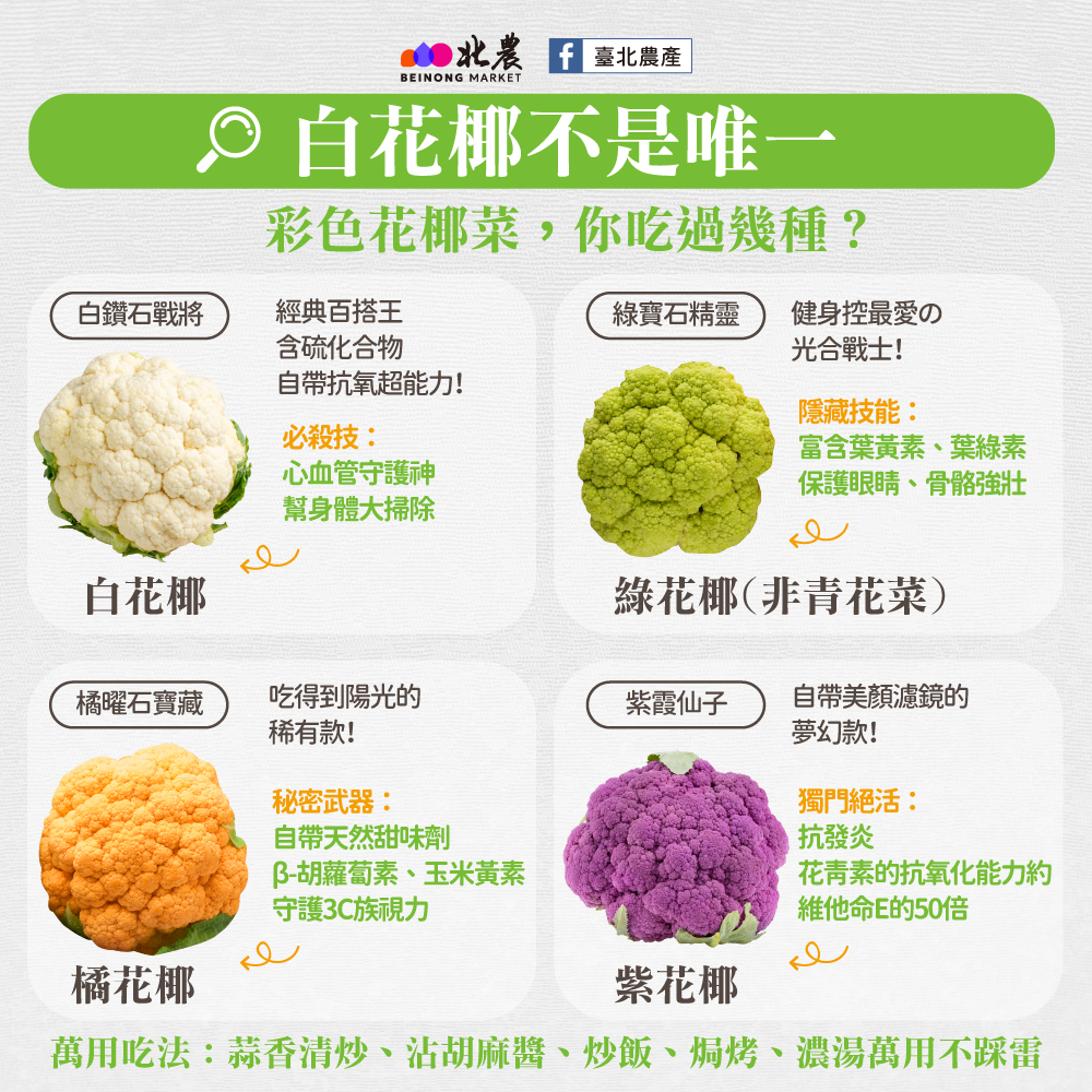 臺北農產建議,花椰菜料理方式相當多元,包括蒜香清炒、川燙拌醬、炒飯、焗烤或濃湯都很合適。若想一次補充多種植化素,可將四色花椰菜組合成「彩虹烤蔬菜盤」,淋上橄欖油,以200度烤約15分鐘,簡單調味即可上桌。