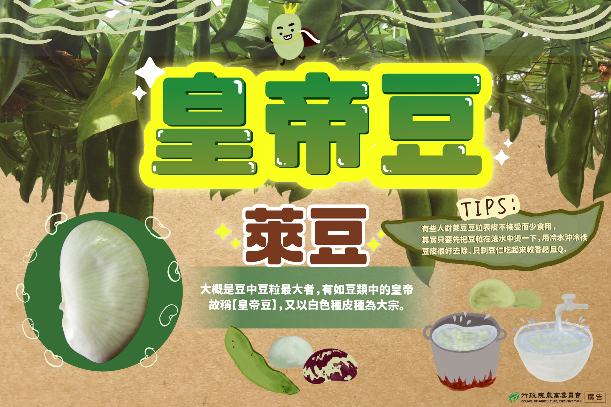 【記者楊東庭整理報導】皇帝豆,真正學名是「萊豆」,因其豆粒體積很大,才有這樣的俗稱,台語叫「皇格豆」。